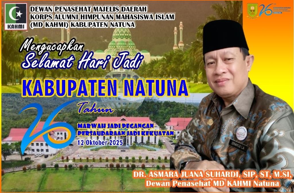 Dewan Penasehat Majelis Daerah Korps Alumni Himpunan Mahasiswa Islam (MD KAHMI) Natuna Dr. Asmara Juana Suhardi, S.I.P., S.T., M.Si., mengucapkan Selamat Hari Jadi Kabupaten Natuna ke-26, (12 Otober 1999 – 12 Oktober 2025). “Marwah Jadi Pegangan Persaudaraan Jadi Kekuatan”.