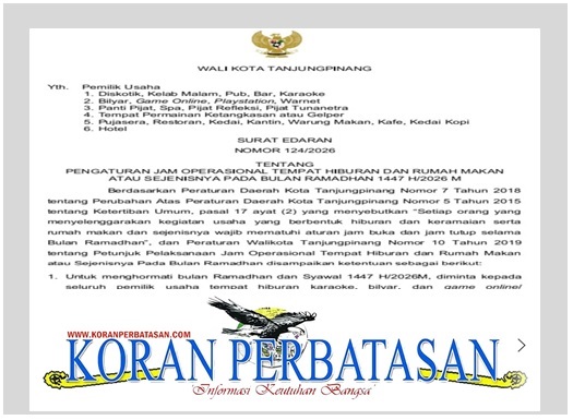Wali Kota Tanjungpinang H. Lis Darmansyah, S.H., menetapkan Surat Edaran Nomor 124/2026 tentang Pengaturan Jam Operasional Tempat Hiburan dan Rumah Makan atau sejenisnya selama Ramadan 1447 H/2026 M yang berlaku bagi seluruh pelaku usaha di Kota Tanjungpinang.