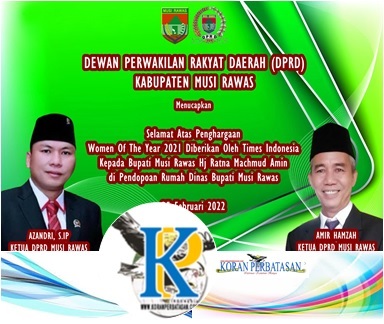 Dewan Perwakilan Rakyat Daerah (DPRD) Kabupaten Musi Rawas Provinsi Sumsel Mengucapkan Selamat Atas Penghargaan Women Of The Year Tahun 2021 Diberikan Oleh Times Indonesia Kepada Bupati Musi Rawas Hj Ratna Machmud Amin di Pendopoan Rumah Dinas Bupati Musi Rawas, 25 Februari 2022.