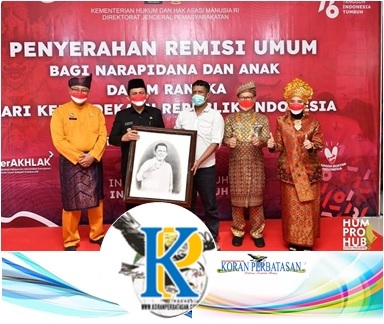 KEPRI – Gubernur Provinsi Kepri H. Ansar Ahmad didampingi Kepala Kantor Wilayah Kementerian Hukum dan HAM Husni Thamrin menyerahkan Remisi Umum bagi narapidana dan anak secara simbolis kepada 2 orang perwakilan di Lapas Narkotika Kelas II. A Tanjungpinang KM 18 Kijang, Kabupaten Bintan, Selasa, 17 Agustus 2021 petang.