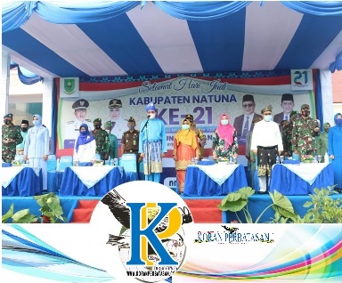 NATUNA (KP),- Bupati Kabupaten Natuna, Abdul Hamid Rizal memimpin upacara pada Peringatan Hari Jadi Kabupaten Natuna ke-21 Tahun 2020 di Halaman Gedung Daerah Kabupaten Natuna, Senin, 12 Oktober 2020 pagi.