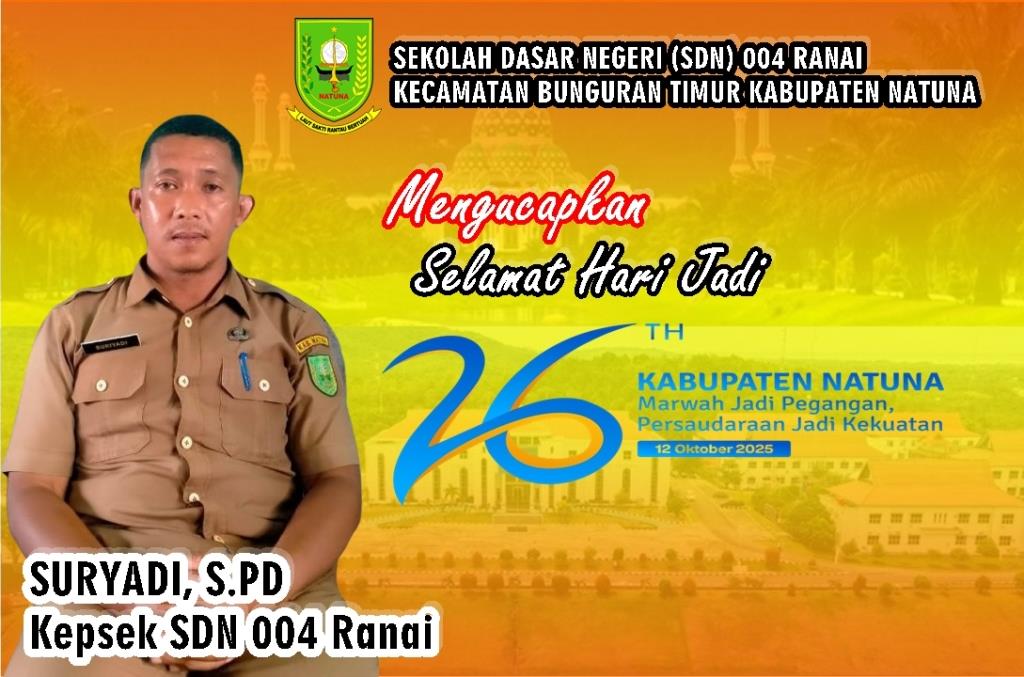 Kepala Sekolah SMPN 1 Bunguran Timur Kabupaten Natuna Provinsi Kepulauan Riau, Suryadi,S.Pd., Mengucapkan Selamat Hari Jadi Kabupaten Natuna Ke-26, (12 Otober 1999 – 12 Oktober 2025). “Marwah Jadi Pegangan Persaudaraan Jadi Kekuatan”.