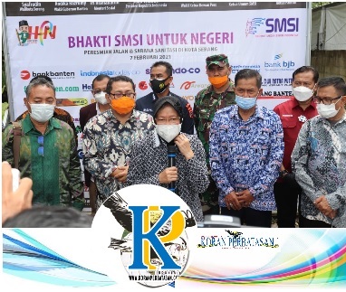 SERANG (KP),- Menteri Sosial Tri Rismaharini mengapresiasi langkah kemanusiaan Serikat Media Siber Indonesia dalam rangka Hari Pers Nasional (HPN) tahun 2021 di Kota Serang.