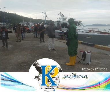 Setibanya kapal cepat MV. VOC Batavia di pelabuhan Tarempa, penumpang langsung diberikan pengarahan oleh petugas gabungan, guna mengikuti aturan protokol kesehatan. Hasil pantauan media ini, dilapangan tampak dua orang anggota dari Tim Gugus Tugas Penanganan Covid-19 Kabupaten Kepulauan Anambas, sedang melakukan penyemprotan disinfektan kepada penumpang dan barang bawaannya.