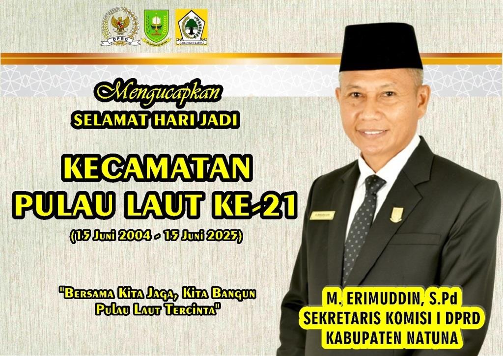 Sekretaris Komisi I Dewan Perwakilan Rakyat Daerah (DPRD) Kabupaten Natuna Provinsi Kepulauan Riau (Kepri) M. Erimuddin, S.Pd Mengucapkan Selamat Hari Jadi Kecamatan Pulau Laut ke-21 (15 Juni 2004 – 15 Juni 2025).