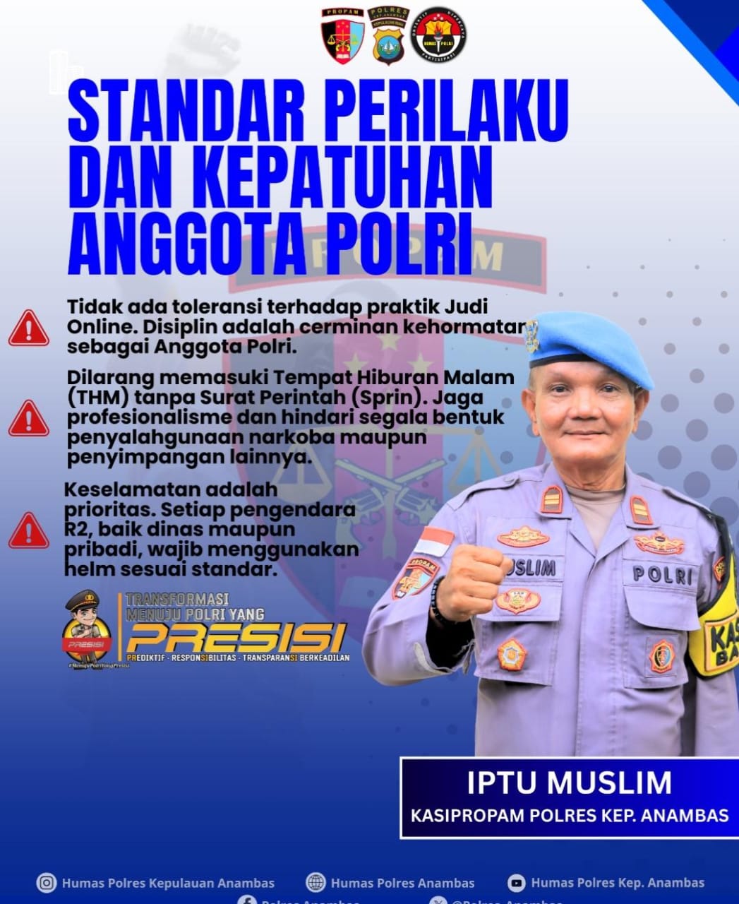 ANAMBAS – Seksi Profesi dan Pengamanan (Sie Propam) Polres Kepulauan Anambas menegaskan komitmennya dalam menegakkan standar disiplin dan profesionalisme seluruh personel. Penegasan ini disampaikan secara langsung oleh Kasipropam Polres Kepulauan Anambas, Iptu Muslim, dalam imbauan kepada seluruh anggota pada Senin (24/11/2025).