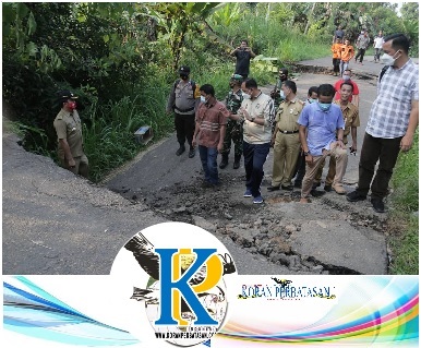 BATURAJA (KP) – Pelasana harian (Plh) Bupati Kabupaten Ogan Komering Ulu (OKU) Drs. H. Edward Candra, MH, meninjau jalan yang terputus akibat intensitas hujan mengakibatkan pergeseran tanah di Desa Kungkilan Kecamatan Sosoh Buay Rayap, Selasa, 25 Mei 2021.